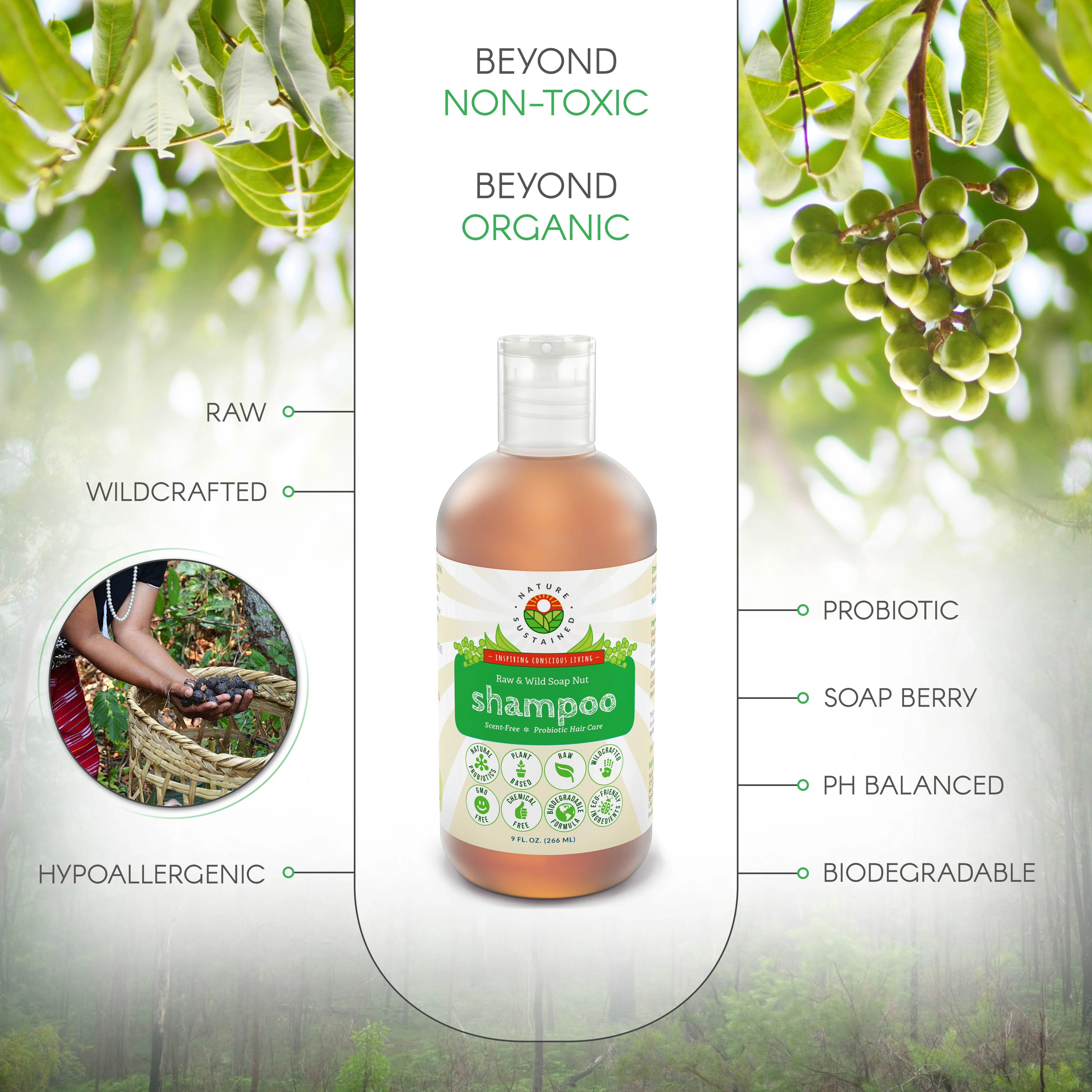 Nature Sustained Raw & Wildcrafted Soap Nut Shampoo with Probiotics.